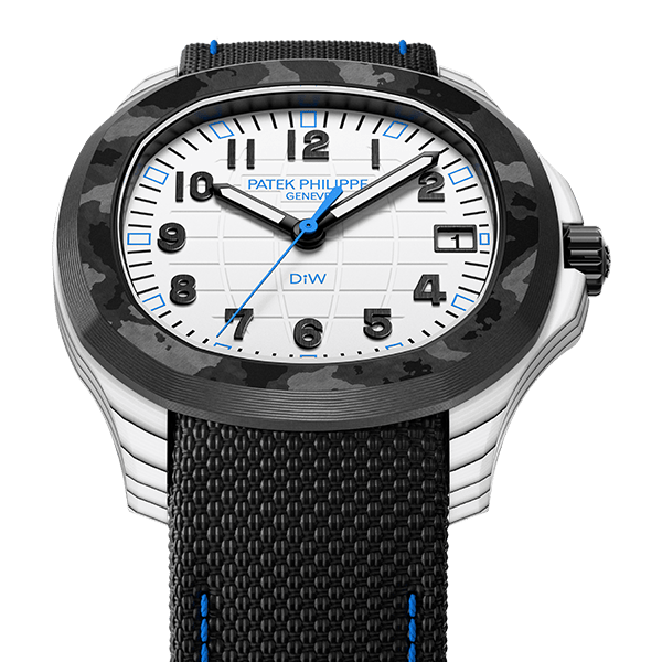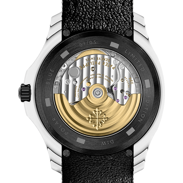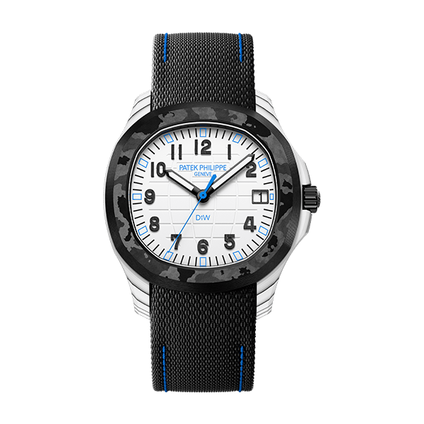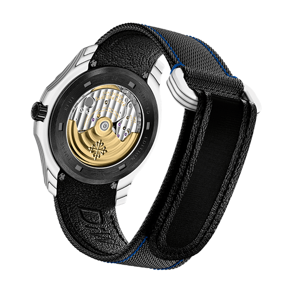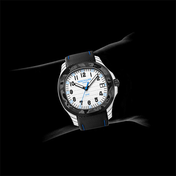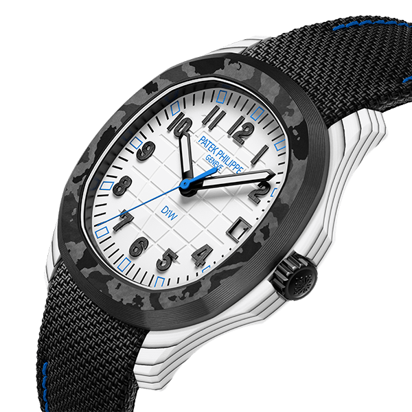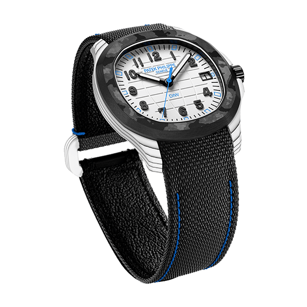 The Aquanaut Polar Blue is a study in contrast shaped through material and light. Crafted in high-end white quartz fiber, its case reflects brightness with a crystalline clarity, while the carbon fiber bezel introduces depth and control. The white dial enhances this balance, complemented by a black strap with blue accents.