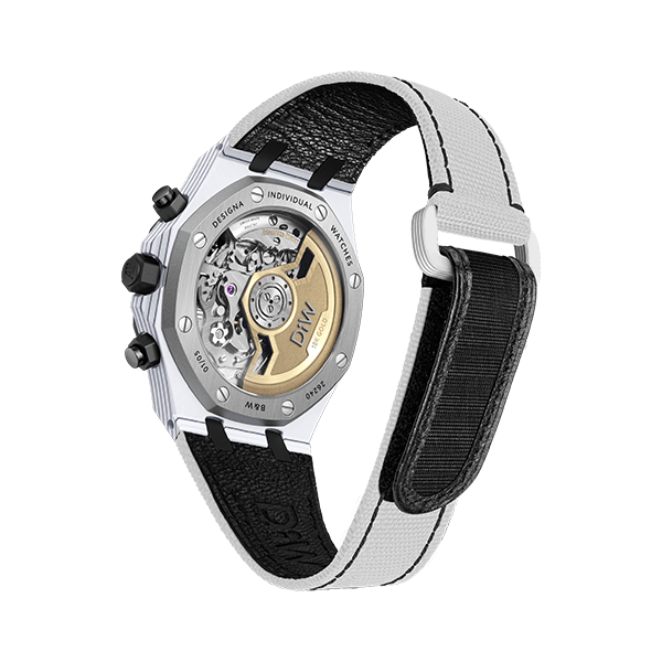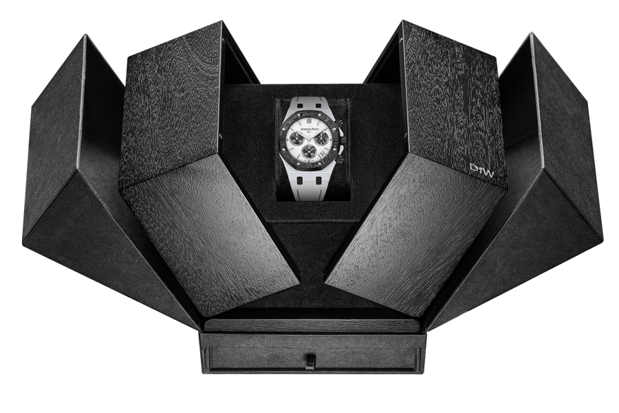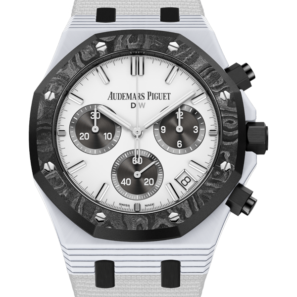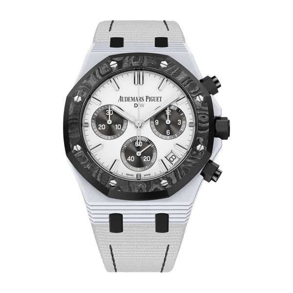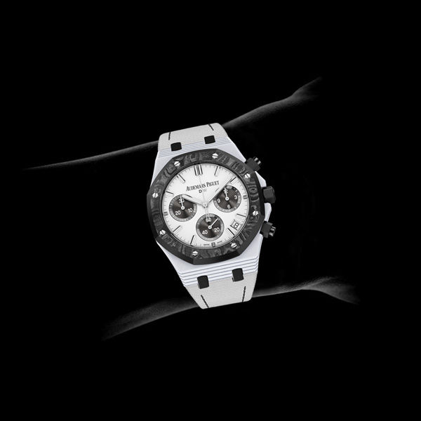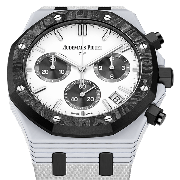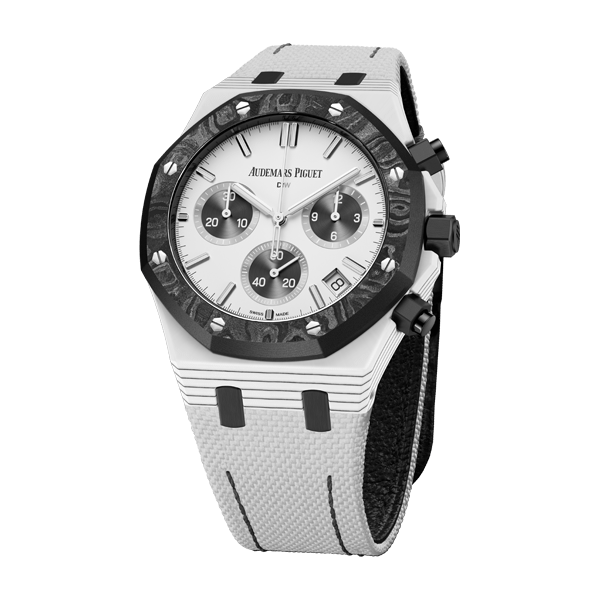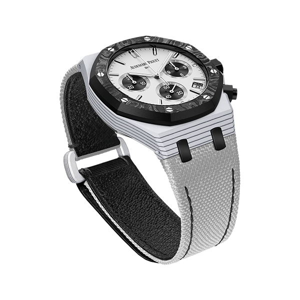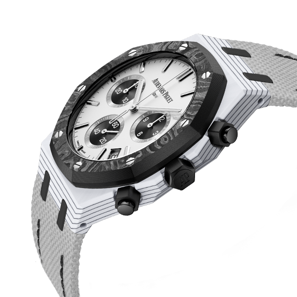 The Royal Oak Chronograph Black&White is a study in contrast and modern finesse. Crafted with precision in high-end white quartz fiber, its monochrome architecture embodies clarity, structure, and balance. Every surface captures the interplay between light and shadow, revealing depth without distraction.