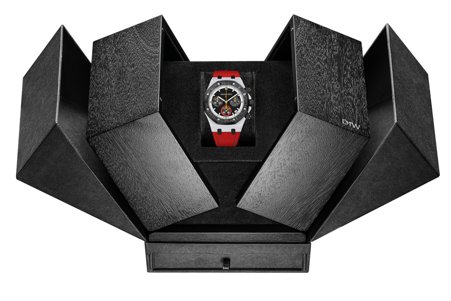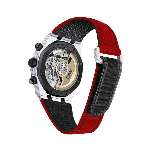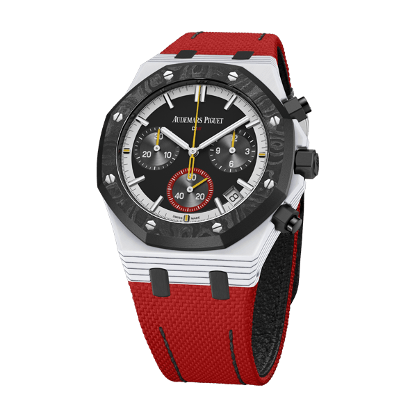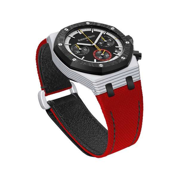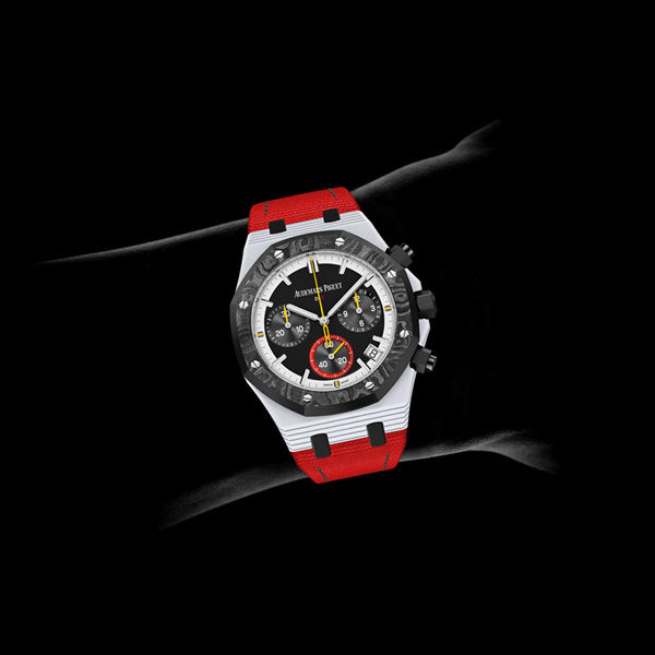 The AP Voidline Pitlane is a composition driven by timing and controlled acceleration. Crafted in high-end white quartz fiber. The black dial, framed by a white ring, creates a defined contrast, while the yellow chronograph hand introduces a precise point of focus — a reference to split-second measurement.